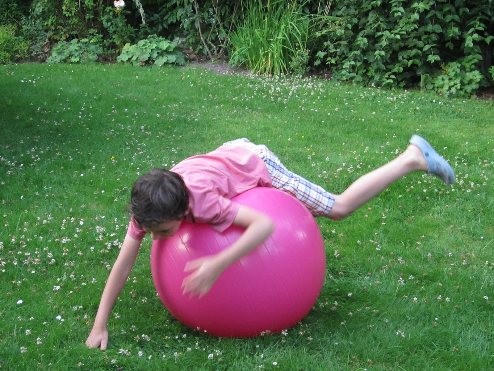 Practicar con el balón Bobath: rodar sobre él, por ejemplo. O levantarlo con ambas manos y hacerlo rodar sobre una pared.