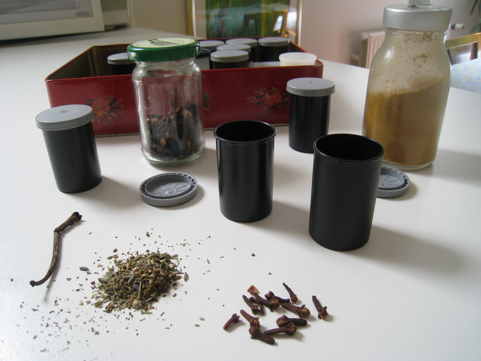 Nosotros utilizamos –ver fotografía- los contenedores de carretes de fotos. Así, llenamos dos cajitas con orégano, dos con clavo, dos con tomillo, dos con café, dos con romero, dos con lavanda, dos con…. Cuantas más tengamos, mejor.