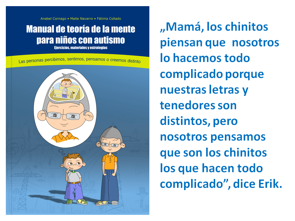 El concepto de Teoría de la Mente se refiere precisamente al conjunto de habilidades para comprender y predecir conductas, intenciones y creencias de otras personas. En el trabajo diario con Erik pude comprobar las dificultades que mi hijo presentaba en ese sentido. Así que empecé a preparar ejercicios, materiales y estrategias. Hoy en día, con siete años, puedo comentar con orgullo que Erik ha avanzado muchísimo.