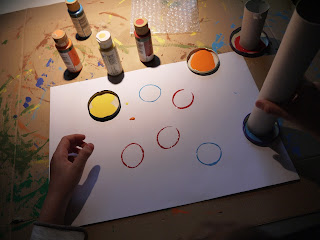En Tapas de botes pones pinturas de colores. Mojas los Rollos, marcas en el papel... y así tienes las siluetas de los planetas o estrellas.